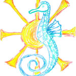 Das gelbe Symbol hinter dem Seepferchen ist meine Form des Ananse Ntontan oder des Spinnennetzes. Ich habe es gelb-rot gemacht damit es leuchtet wie die Sonne. Es stammt aus Afrika und steht für Weisheit, Kreativität und die Komplexität des Lebens. Weisheit bedeutet Erfahrung, Wissen und gute Entscheidungen und Handlungen zu tätigen. Kreativität bedeutet die Intuition, Fantasie und neue Ideen ins eigene Leben und in die Kunst einzubringen.